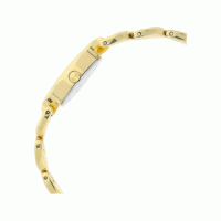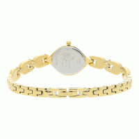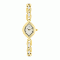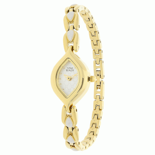 This analog watch for women has a white, patterned dial, shaped like an eye. The dial is enclosed in a gold case that has a crown. There are markings at the five minute intervals for easy reading. Made of brass, its gold and silver colour strap is secured by a jewellery clasp.