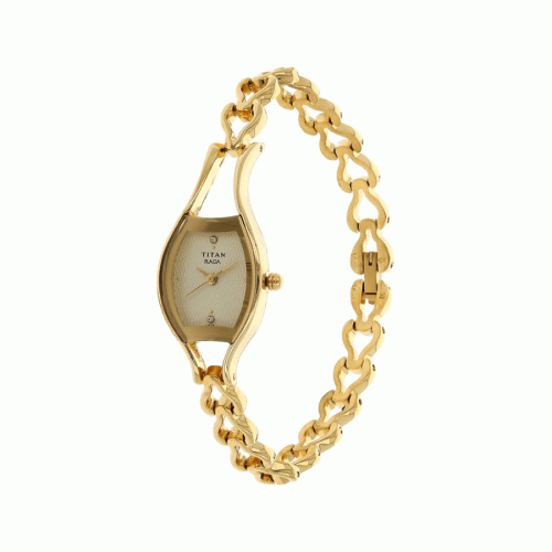 This analog watch for women has a champagne dial with three plain hands and markings at the quarter intervals. The dial is enclosed in a gold case that has a crown. Made of solid links, its gold strap is fitted with a jewellery clasp.