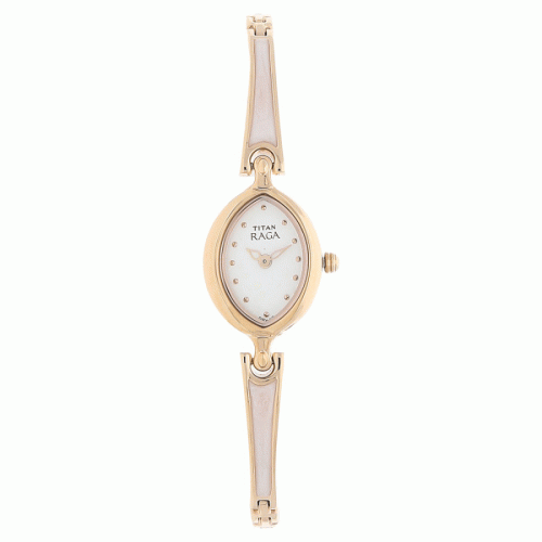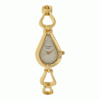 This analog watch for women has a white dial, shaped like a teardrop. Featuring three plain hands and markings at the 30 minute intervals, this dial is enclosed in a gold case that has a crown. Its gold strap, made of solid links is fitted with a jewellery clasp.