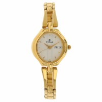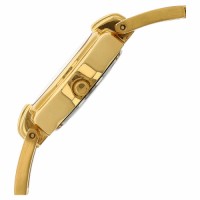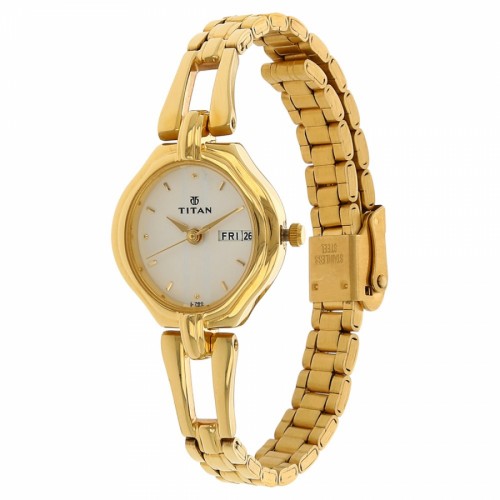 This analog watch for women has a white dial, featuring three plain hands, markings at the five minute intervals and a day and date display at the 3rd hour interval. A crown on the gold case lets you adjust the time. Its stainless steel, gold strap is fitted with a special three piece sliding clasp.
