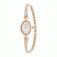 This analog watch for women has an off-white dial that is round. Featuring two plain hands and markings at the five minute intervals, the dial is enclosed in a rose gold case that has a crown. Its rose gold and white strap is made of brass and fitted with a jewellery clasp.
