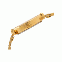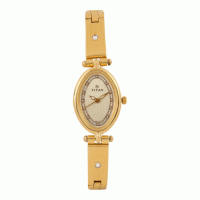 This analog watch for women has an oval, champagne dial. The dial features plain three hands and markings at five minute intervals. A crown on the golden case lets you adjust the time. The golden, stainless steel strap is fitted with a special three-piece sliding clasp. Equipped with 3 ATM water-resistant depth, the timepiece is user-friendly. It comes with a 24-month warranty.