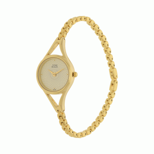 This analog watch for women has a eye shaped, Gold, patterned dial. Featuring three plain hands, the dial has markings at quarter intervals for easy time reading. This timepiece features a Gold, solid link strap, fitted with a jewellery clasp.