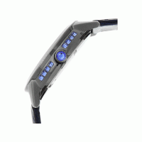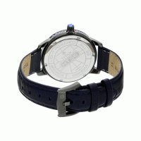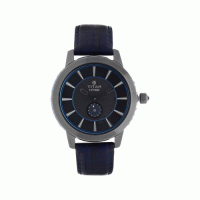 This analog watch for women contains a black and blue round dial, housed in a stainless steel case. Two hands and stick markings are present on the dial, allowing easy time reading. A crown present lets you adjust the time. A leather strap, with a metal adjustable buckle closure, is blue.